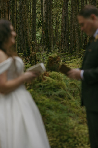 As we walked the trail in the early morning hours, the air was cool and still — there was a kind of silence that makes every spoken word feel more meaningful. Time seemed to slow. Their private vow ceremony was simple and heartfelt. Filled with tears of love, and whispered promises. They stood together in a small clearing, reading handwritten vows surrounded by towering spruce and maple trees wrapped in velvet moss.